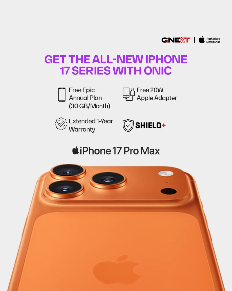 Order the latest iPhone 17 Family and iPhone Air with Onic and experience the ultimate upgrade. Every phone comes bundled with a FREE Onic Epic Annual Plan (30GB/month), plus other exciting freebies including 20W Apple Power Adapter, Shield+ Protection for 1× front screen and 1× back glass damage within the first 12 months, and Extended 1-Year Warranty.